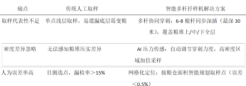 智能多桿扦樣機(jī),由多個(gè)扦樣桿組成,這可不是擺設(shè),多桿同時(shí)作業(yè),完成扦樣的速度杠杠的。提升檢測的準(zhǔn)確度,降低人工扦樣風(fēng)險(xiǎn),簡化扦樣流程。在一些企業(yè)的實(shí)際應(yīng)用中,智能多桿扦樣機(jī)取樣檢測出的霉變粒,雜質(zhì)率比人取樣高21%,貼近真實(shí)質(zhì)量。